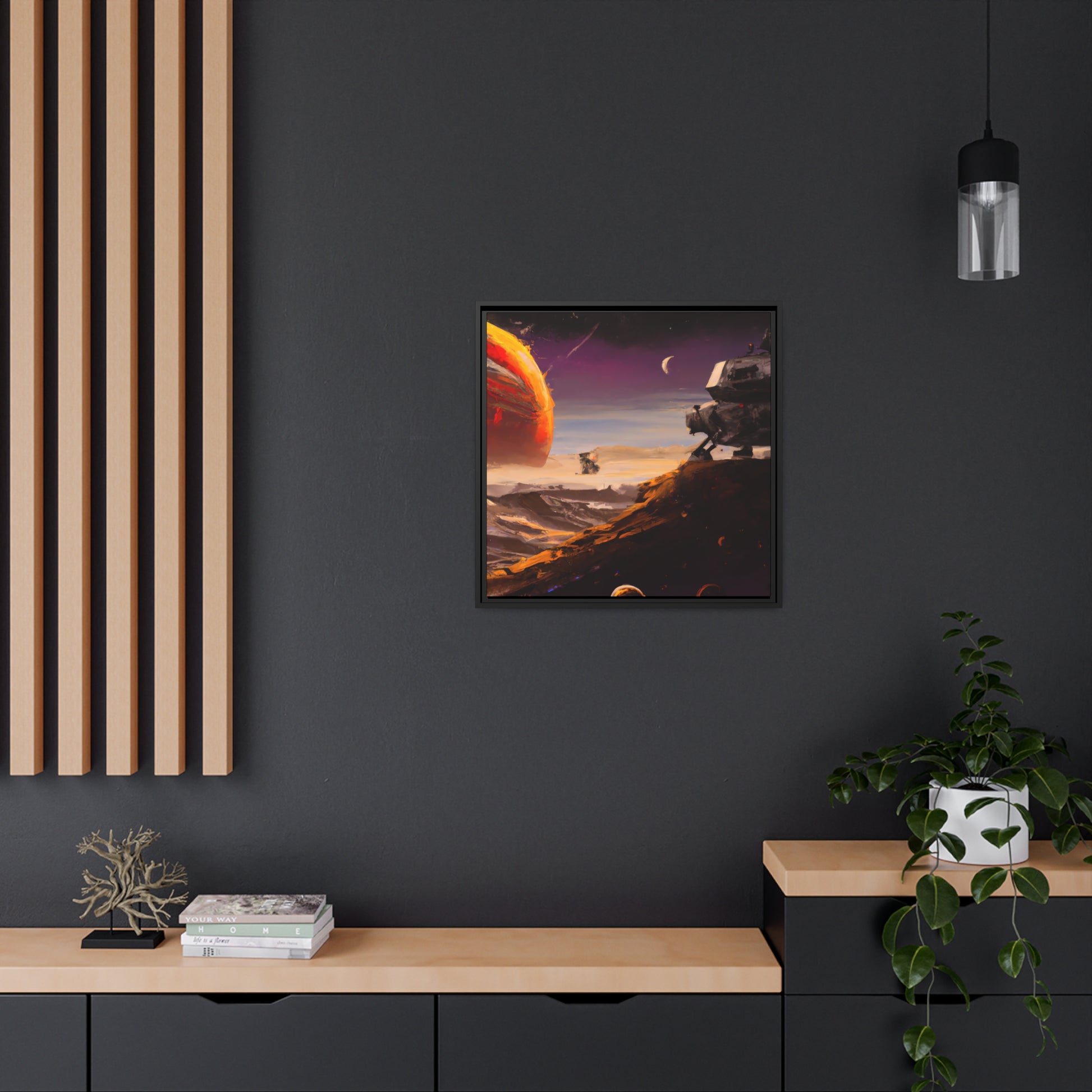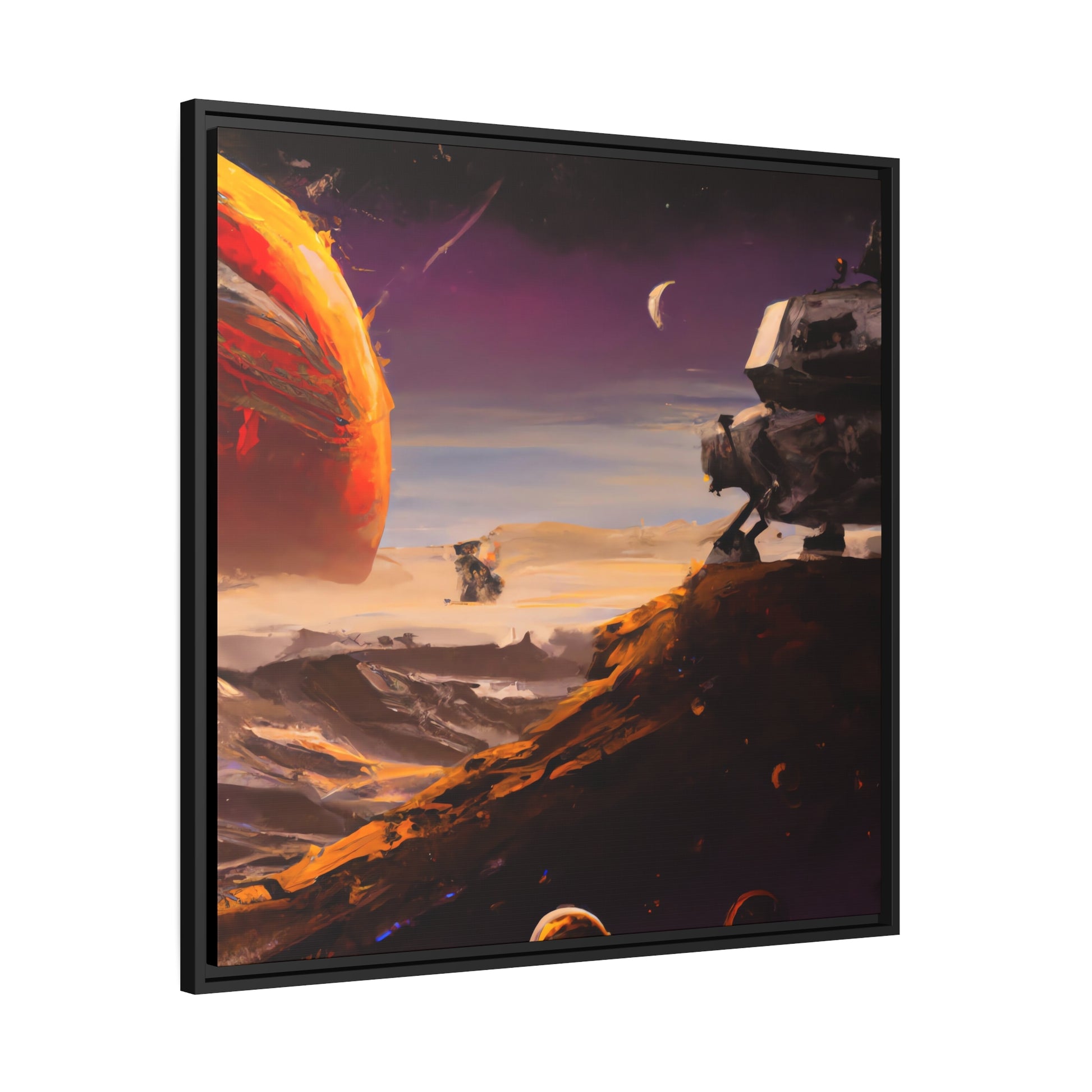 This unique digital artwork features an astronaut and space ship boldly exploring a galaxy of unknown planets and alien worlds. Our detailed canvas print will become a centrepiece in any room, inspiring the imagination and taking viewers into parts unknown. #spacescene #astronaut #spaceship #galaxy #unknownplanets #alienworlds #explore #journey #artistic #scenery #painting