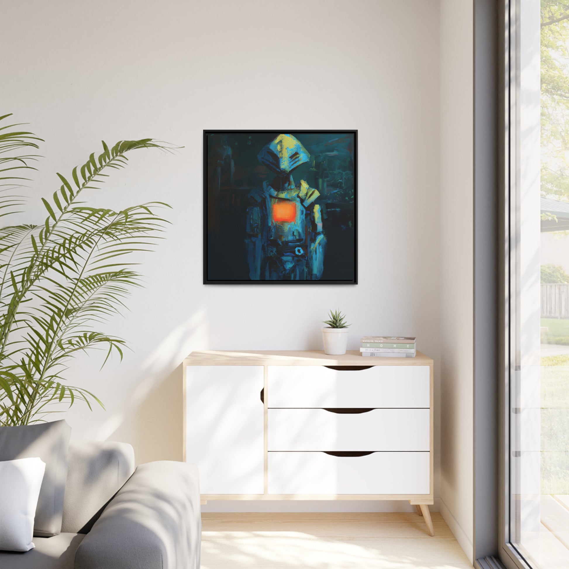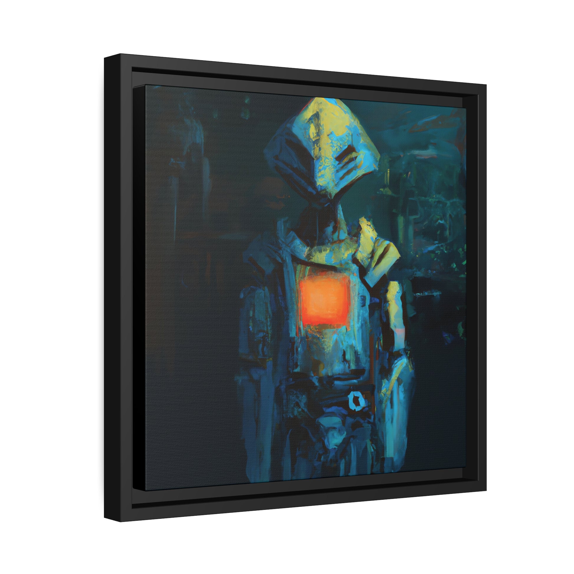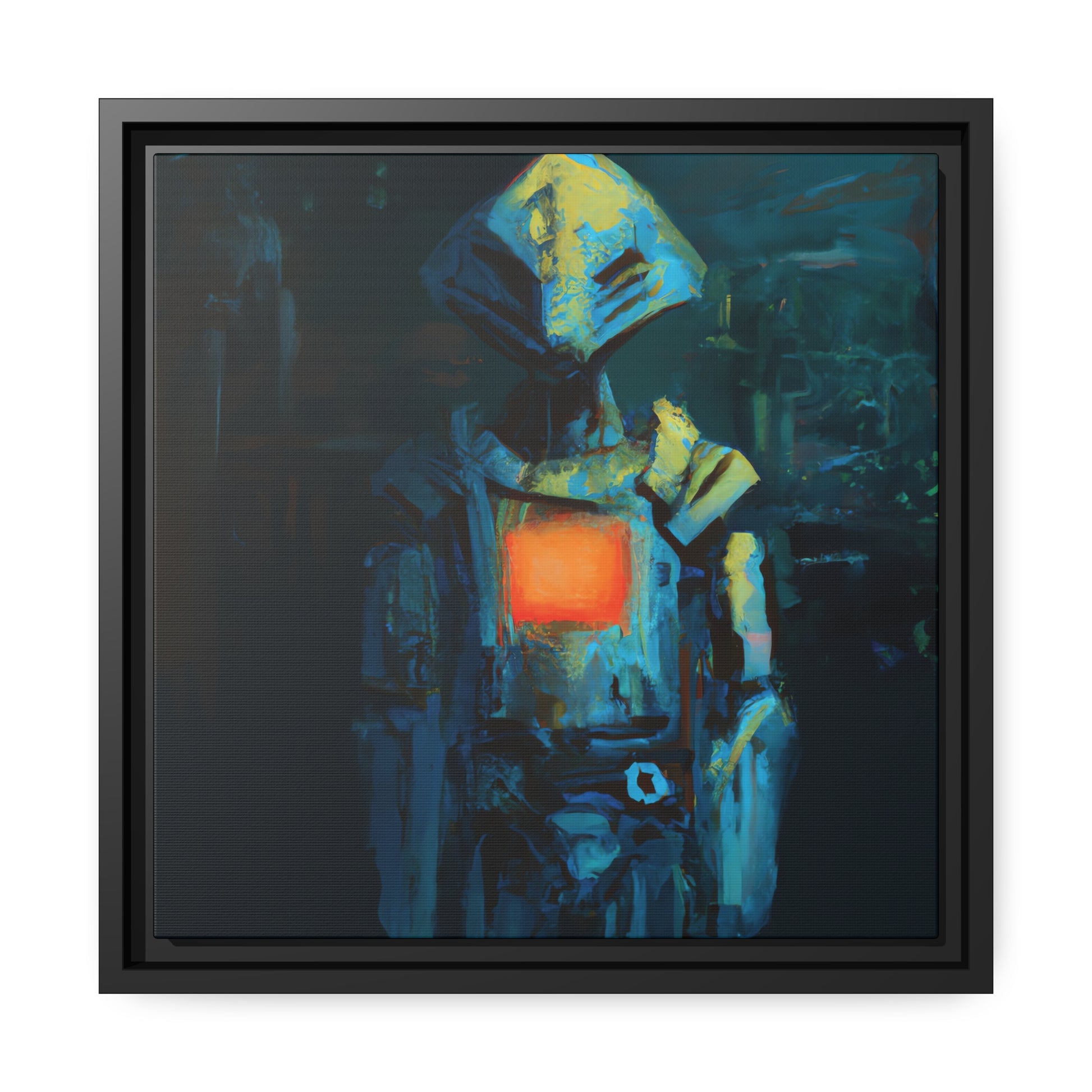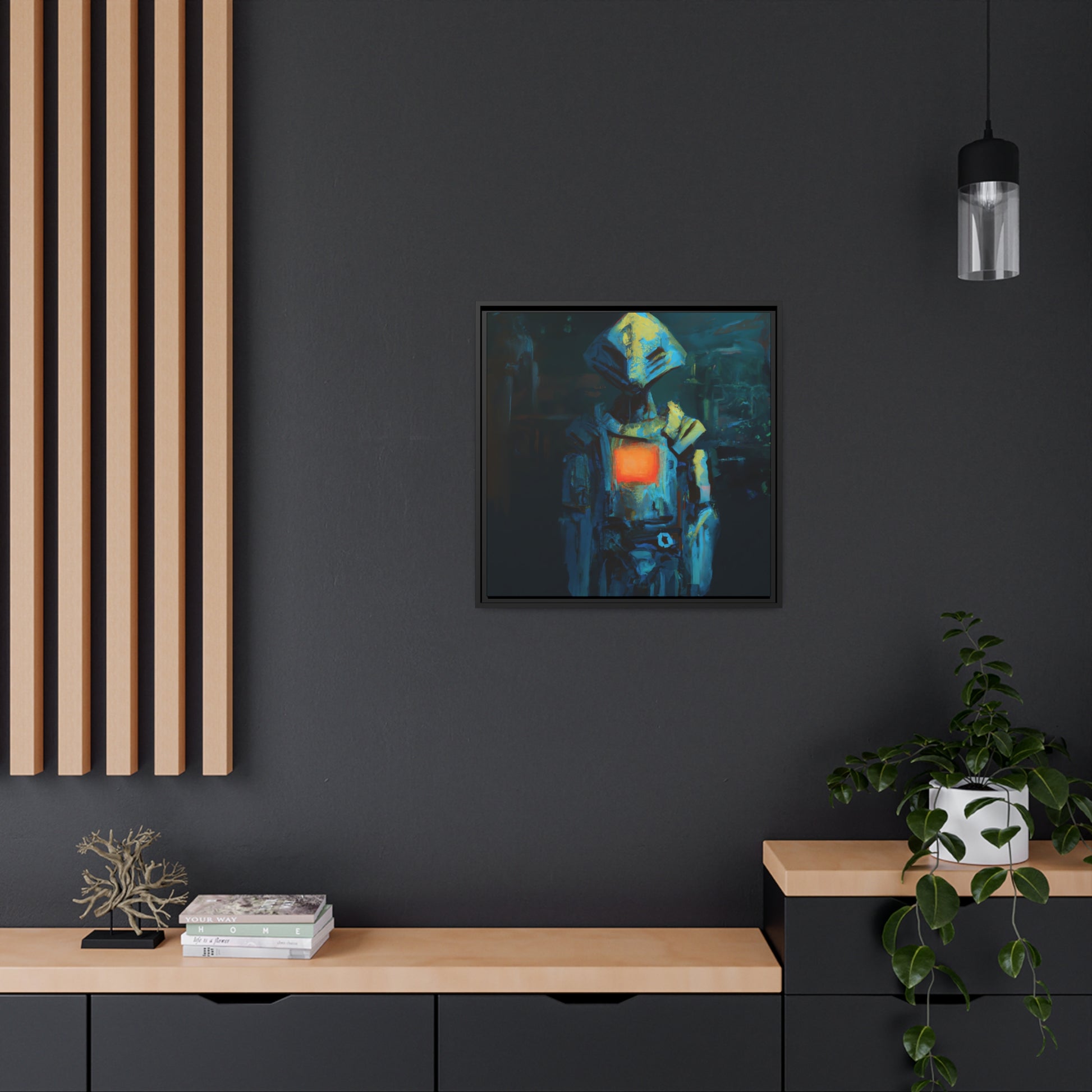 This unique painting allows your home to transform into a sophisticated and futuristic set. A captivating portrayal of an android emerges in this artwork, channeling a soft, painterly brushwork style. The fusion of retro-futuristic cyberpunk aesthetics, with its dark cyan and light amber palette, creates a visually striking composition. Rooted in robotic expressionism, the painterly approach adds depth to the portrayal, engaging viewers through gestural nuances. #robot #digitalart #vibrant #canvas #future #creative #intricate #cool #uniquepainting #transform #sophisticated