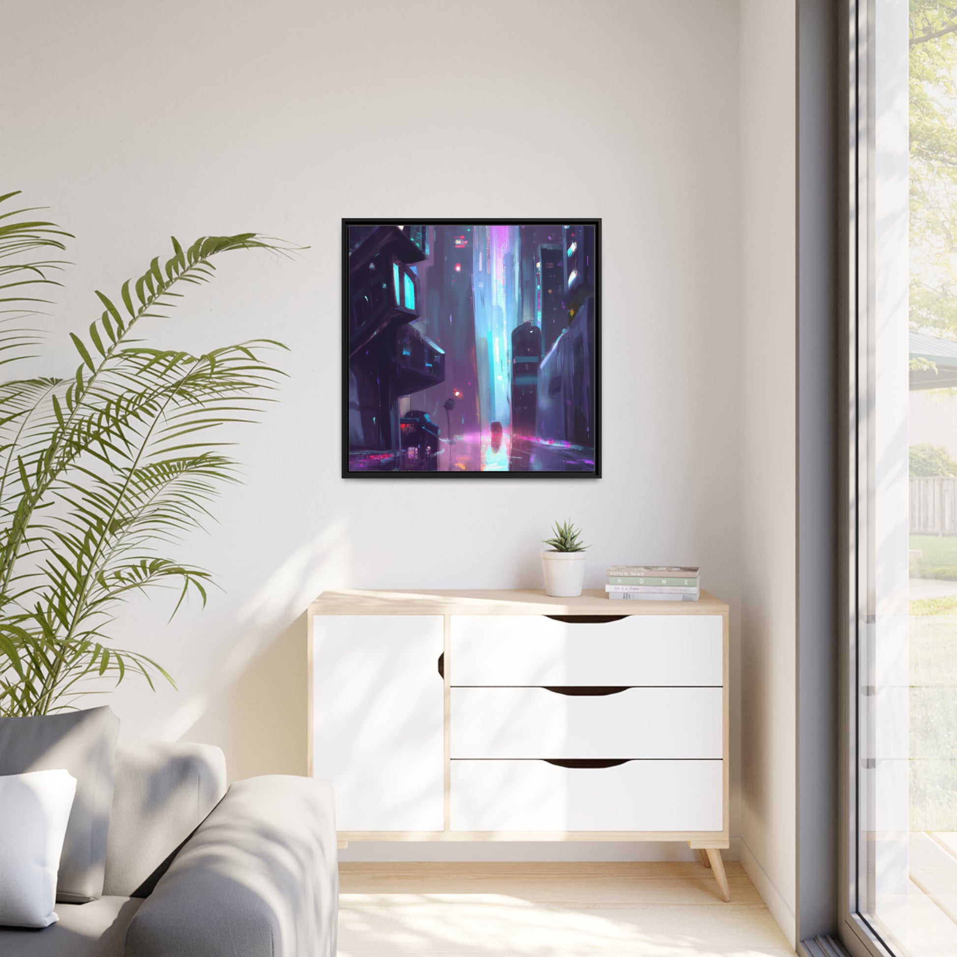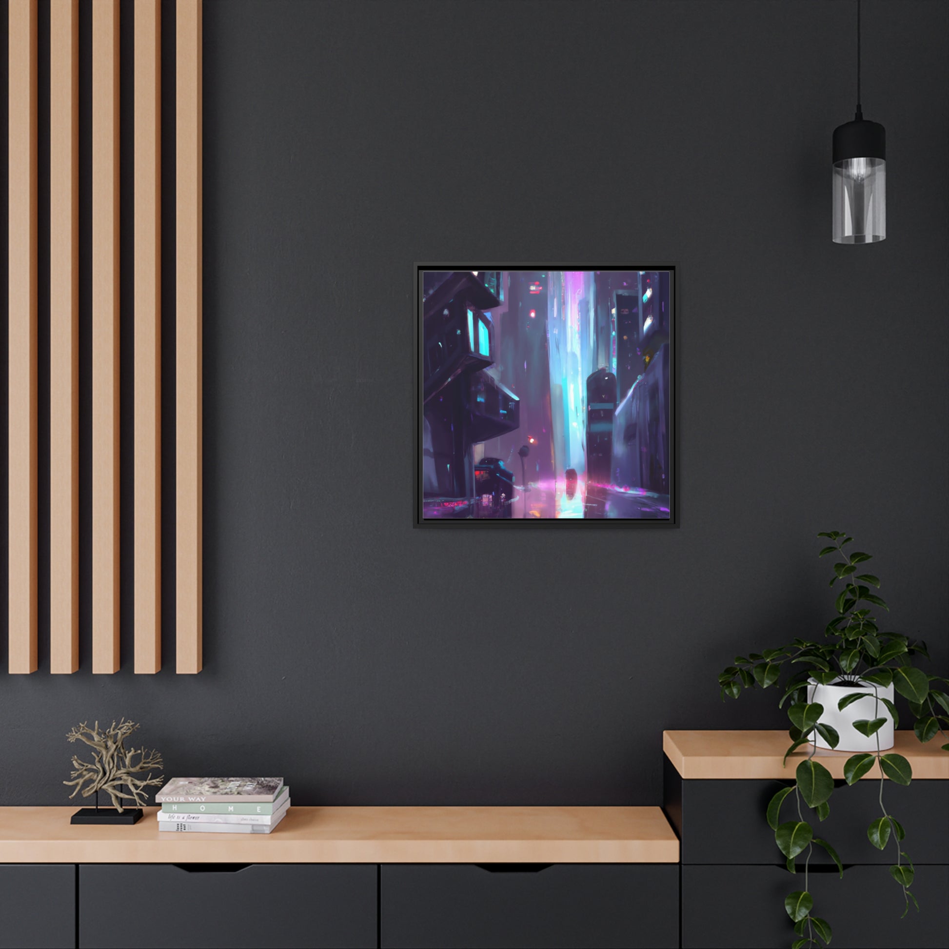 This digital art will take you on a trip through a cyberpunk dream. Painted in vibrant, neon colors and perfect for adorning any wall, this canvas presents a dystopian vision with a hint of hope. Get transported to a world where the past and future collide - a perfect accompaniment to any synthwave enthusiast. #cyberpunk #neon #synthwave #digitalart #canvaswallart #aesthetic #decor #painting #future #past #dreams