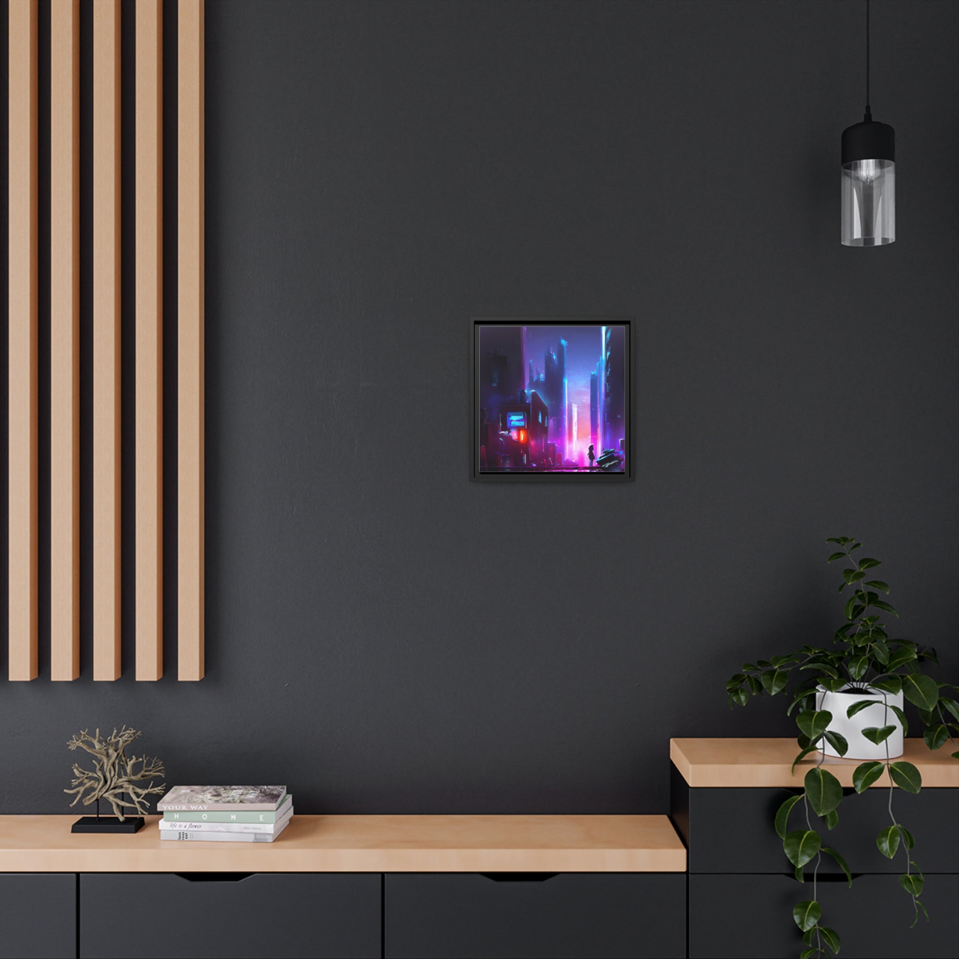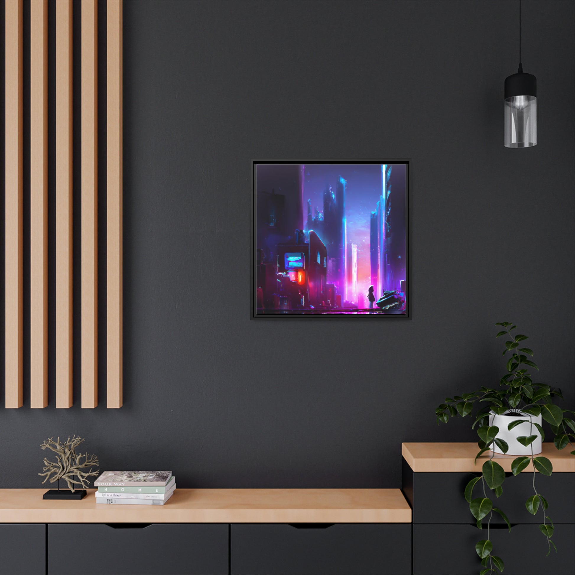 This canvas displays a stunning cyberpunk painting featuring a vibrant color palette to capture the essence of synthwave and digital art. Crafted from a high-quality cotton blend, it has a durable finish that will securely hold the video game-inspired painting. Sure to liven up any space, it's the perfect addition for modern & minimalist interiors. #cyberpunk #synthwave #digitalart #canvasart #videoart #cyberart #scifipainting #futuristicart #streetart #vibrantart #modernart
