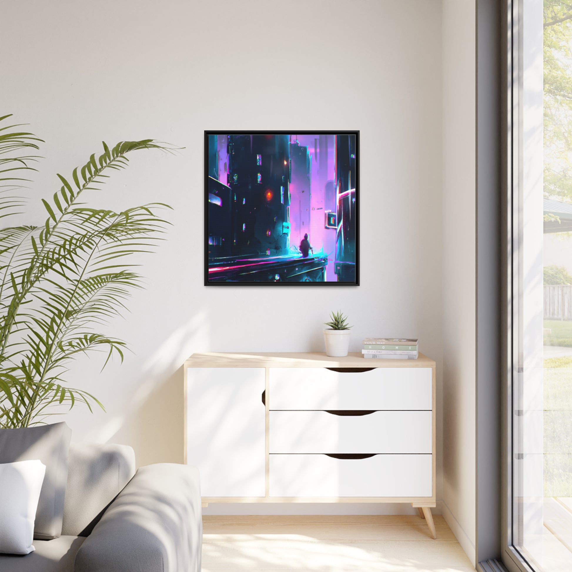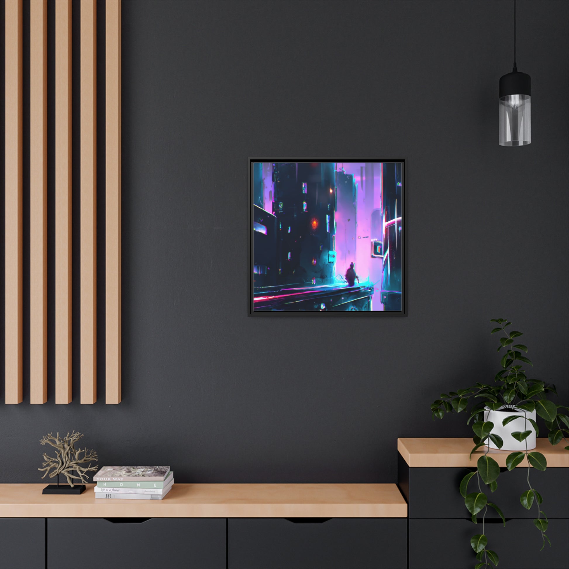 This cyberpunk painting brings a wave of nostalgia back from the 80s and the future. Produced on a high-quality canvas framed for your convenience, it captures the true essence of synthwave and digital art to create an eye-catching visual representation of a cyberpunk landscape. #cyberpunkpainting #synthwave #digitalarth #cyberpunk #80s #painting #canvas #artwork #visualart #framedcanvas #artdecor
