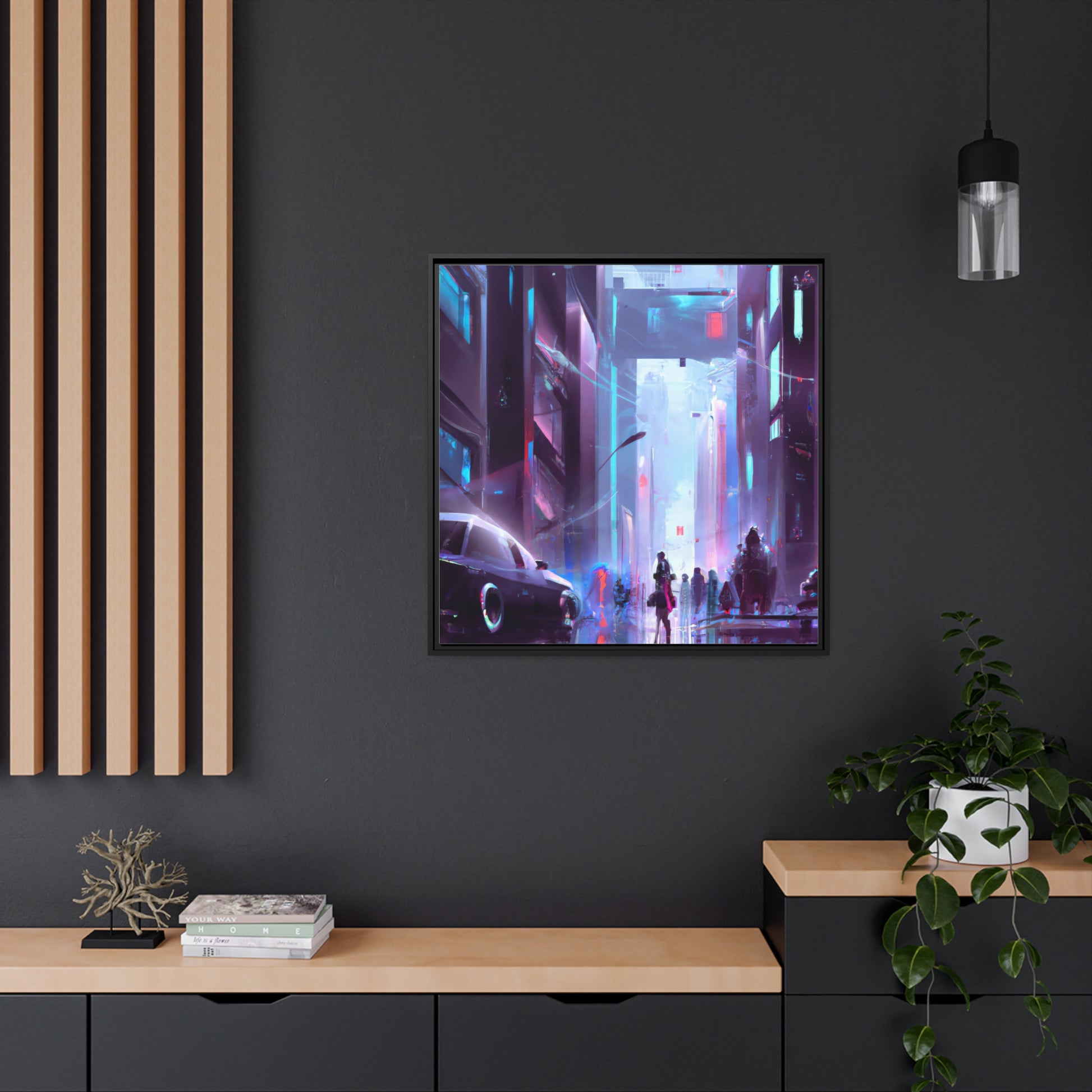 This vibrant digital art canvas brings an electrifying synthwave feel to your home. The glittering white lights and cool neon shades will create a unique, dynamic cyberpunk atmosphere. The captivating and futuristic details of this canvas can inspire daydreams of a world beyond. #cyberpunk , #neon , #synthwave, #futuristic , #digitalart , #art , #canvasart , #vibrant , #dynamic, #canvas, #electrifying