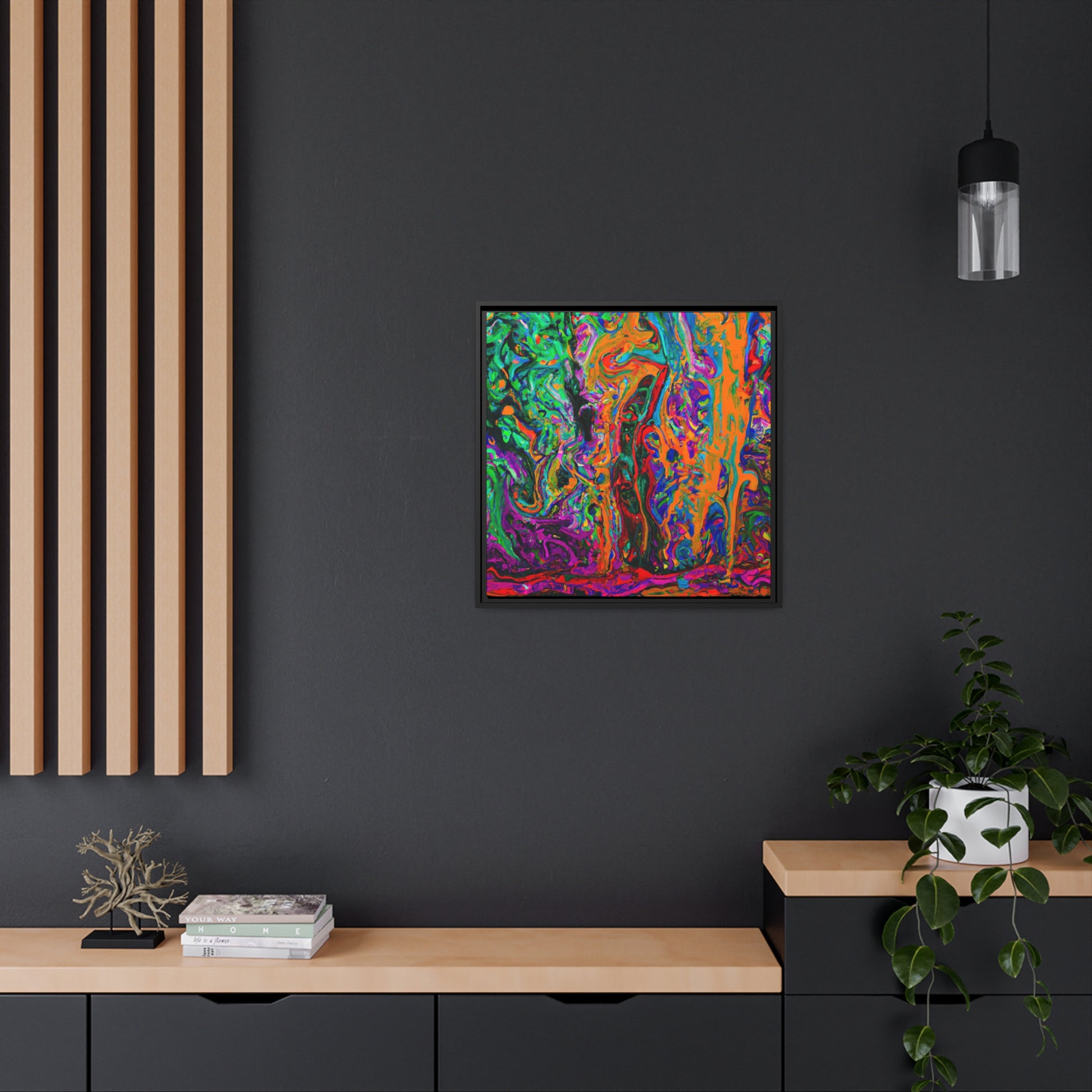 This bold and trippy canvas will energize any home or office. Multi-coloured, abstract swirls captivate and mystify, adding wild energy to your walls. The beauty of this painting is that you can make meaning of its abstract brush strokes, or simply bask in its chaotic energy. #canvasart #abstract #acrylic #painting #trippy #colourful #bold #energy #energyart #wallart #homedecor