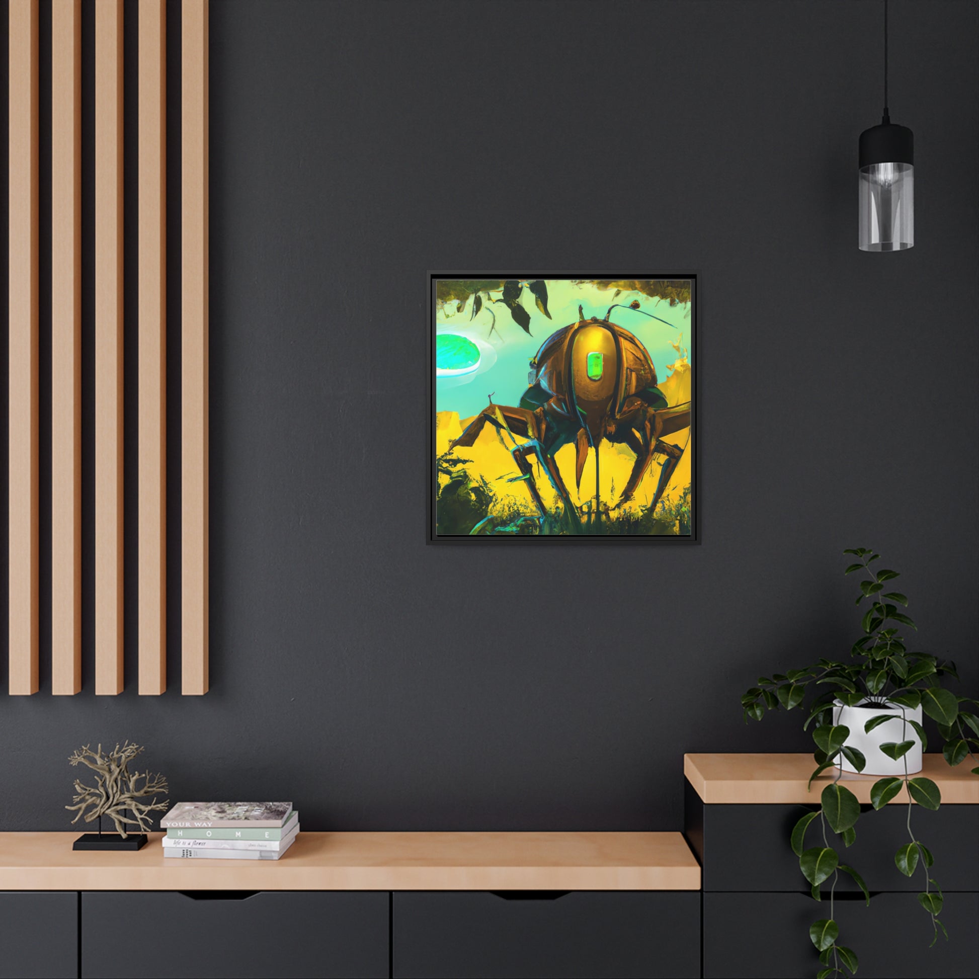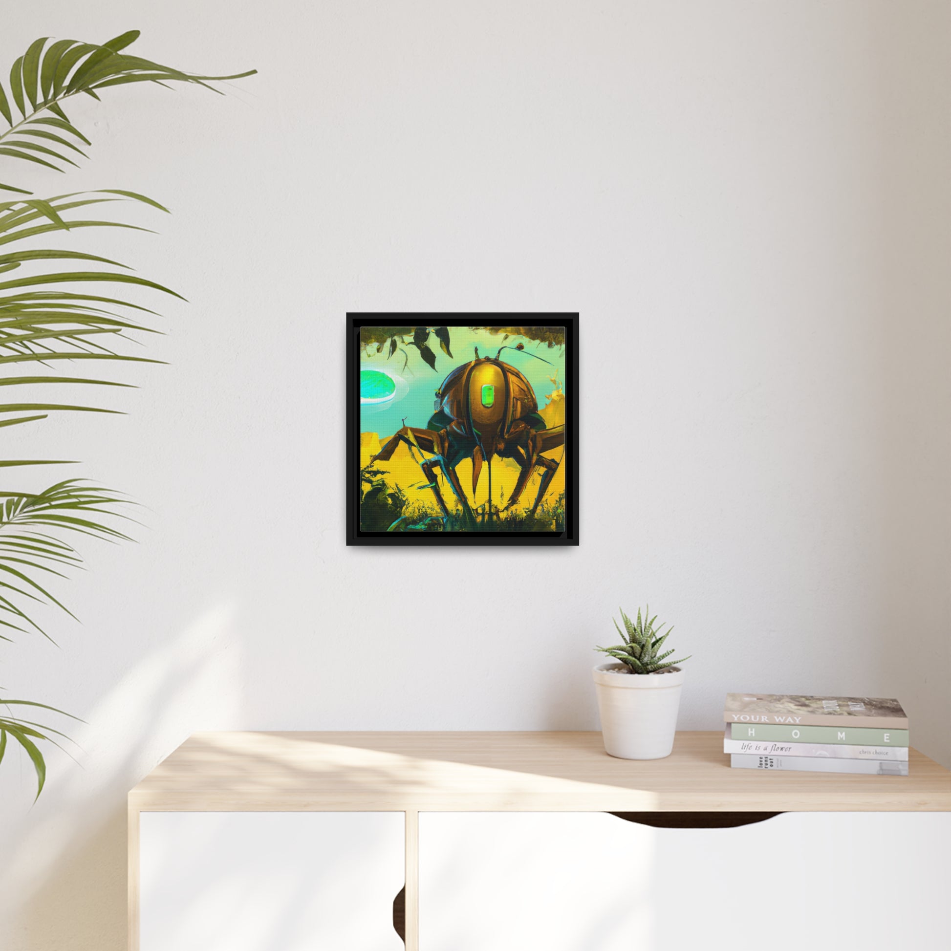 Bring the outdoors in with this modern depiction of nature. Our digital art canvas features a cyber insect set among a vibrant landscape. This piece captures a unique blend of the organic and artificial in a modern and eye catching way. Whether hung in an office or living room, it's sure to bring a dynamic and living touch to any space. #digitalart #canvas #cyberinsect #nature #modernart #artwork #interiordecor #technology #contemporaryart #modernpainting #scifiart