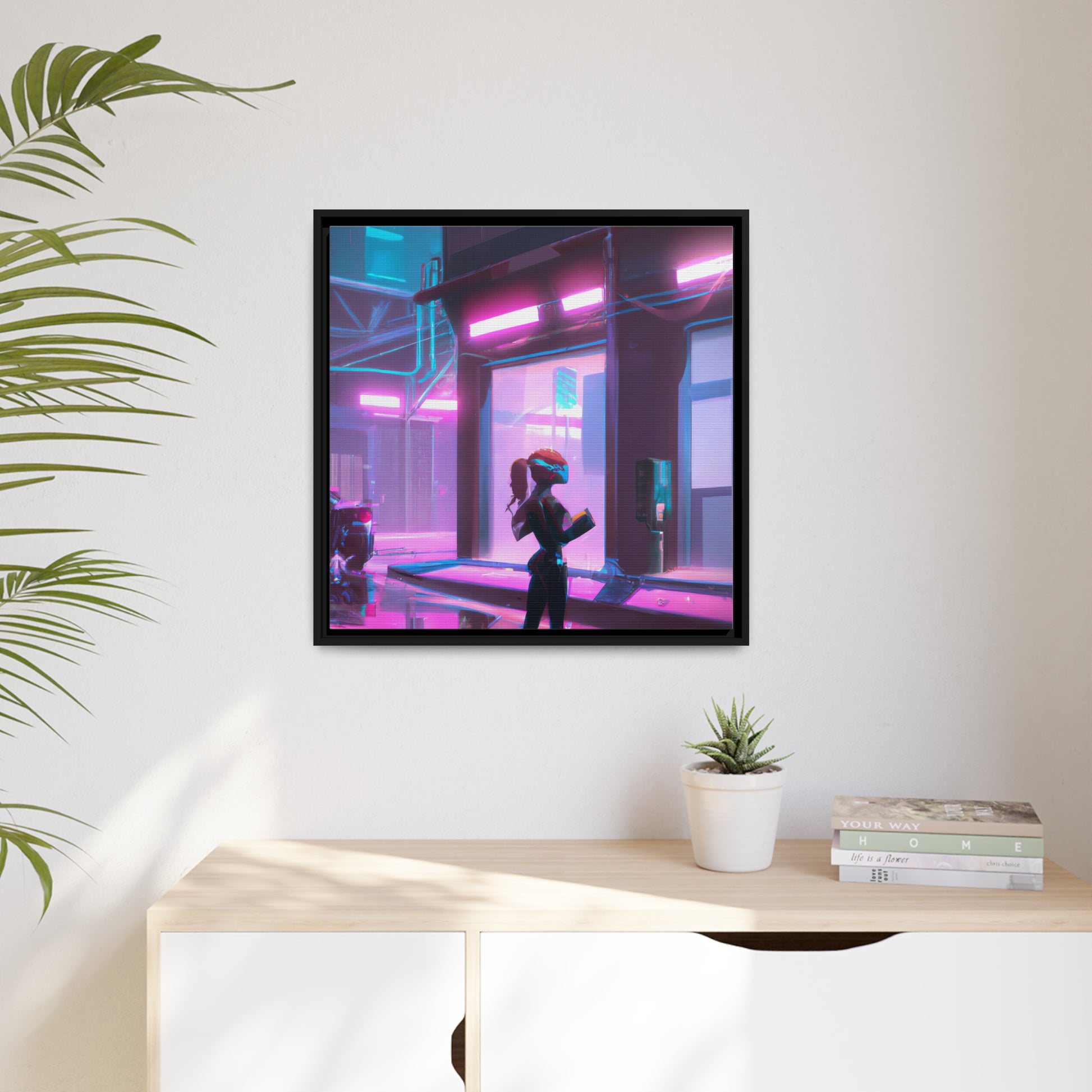 Unlock the digital aesthetic of the future with this striking canvas of a Cyberpunk painting. In this vibrant scene, neon colors and tech-savvy shapes blend into an ambitious masterpiece that depicts the potential of mankind. Place it on your wall, and let it show off your passion for all things digital and futuristic. #cyberpunk #synthwave #digitalart #future #neon #vibrant #techsavvy #canvas #painting #striking #ambitious